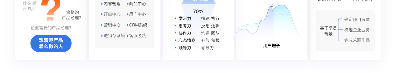 新增產(chǎn)品基礎(chǔ)、電商項(xiàng)目、移動(dòng)端項(xiàng)目實(shí)戰(zhàn)、項(xiàng)目管理、互聯(lián)網(wǎng)金融